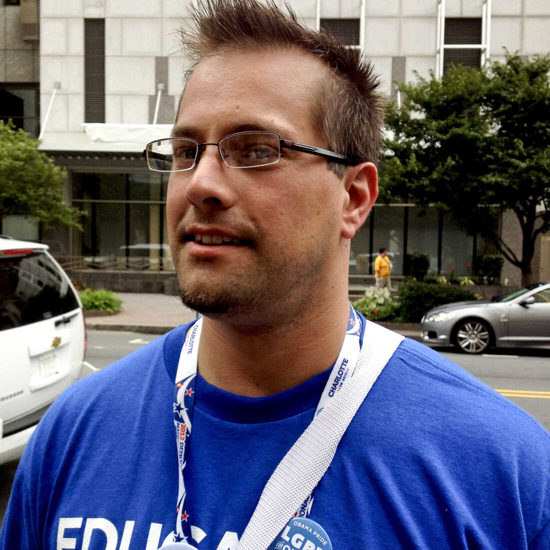 Delegate Mike Evans, 34, is a high school teacher in Missouri. Becky Lettenberger/NPR hide caption