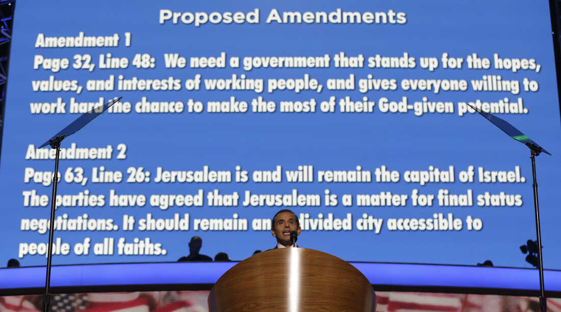 It turns out this year's platform committee dropped a few words from the 2008 version — leaving out language proclaiming Jerusalem the capital of Israel, and excising the "God-given" from a 2008 passage that supported all Americans' right to "make the most of their God-given potential."