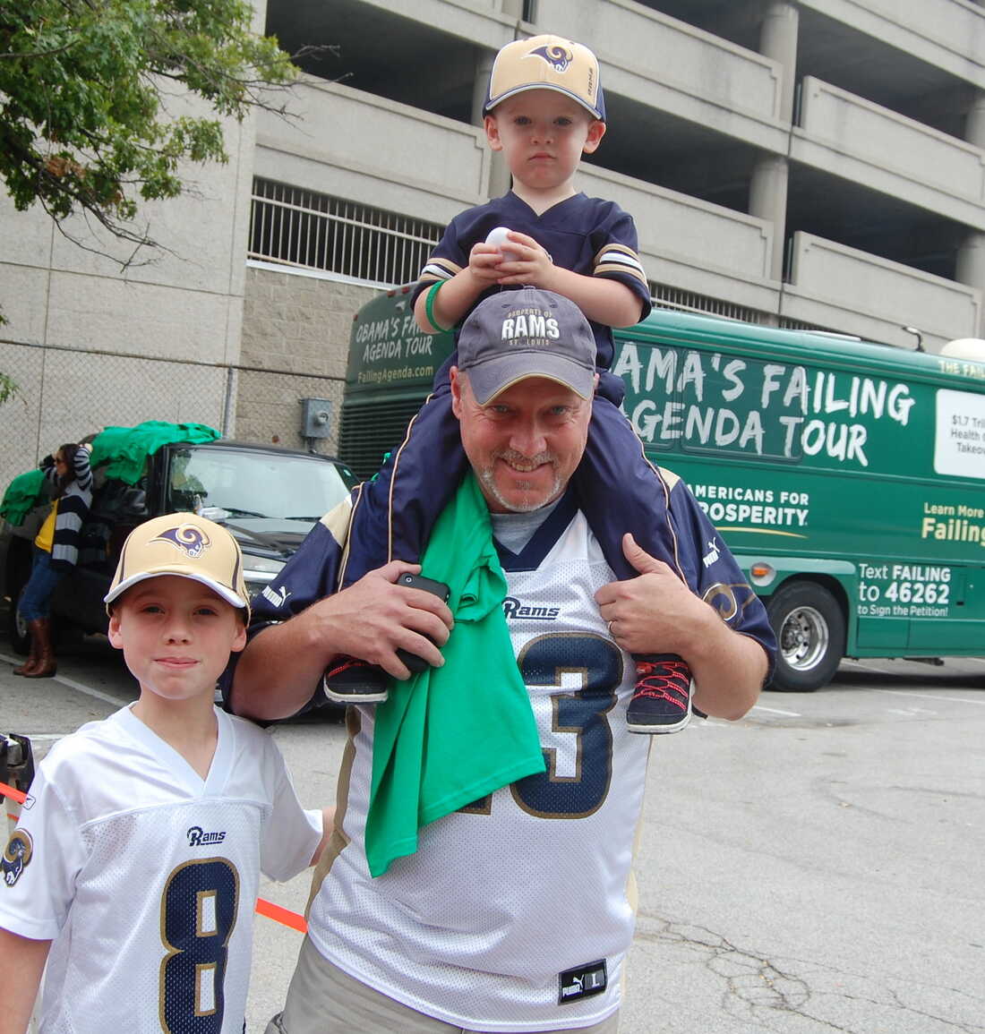 Rowdy Smith, who brought his sons to the St. Louis Rams game on Sunday, said that President Obama's "not a leader" and is hurting the energy industry. He's shown here walking in front of the Americans for Prosperity campaign bus.