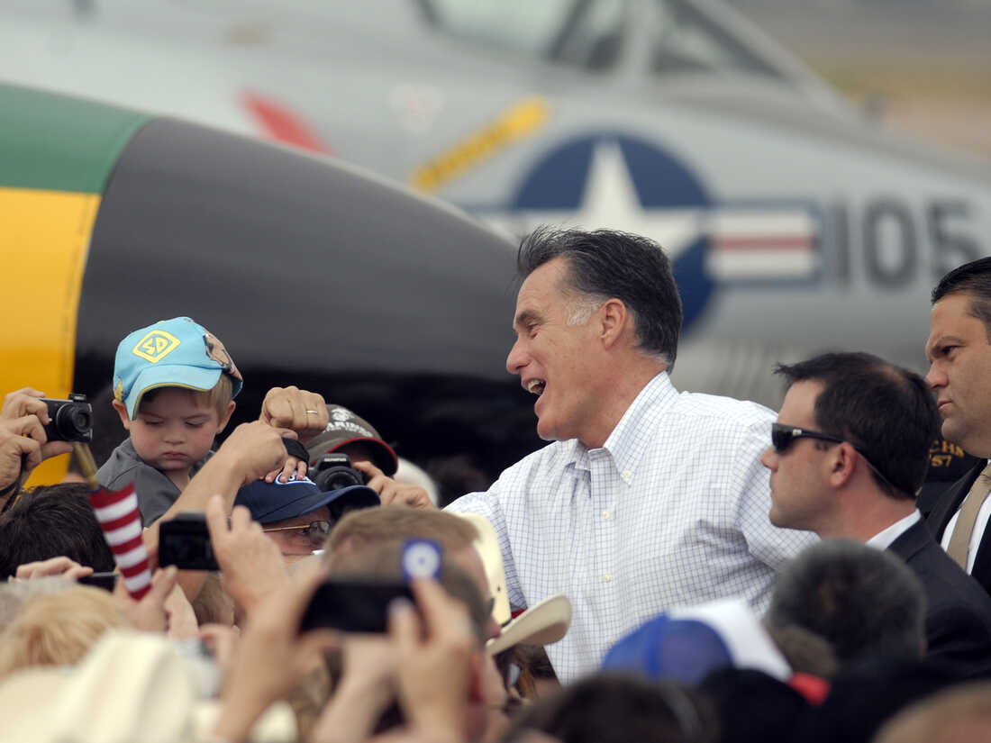Republican presidential nominee Mitt Romney shakes hands at an aircraft museum in Pueblo, Colo., Monday. Bryan Oller/AP hide caption