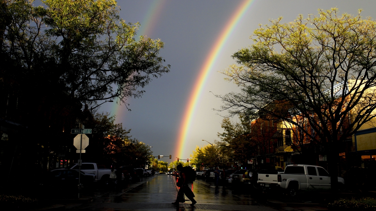 A rare thunderstorm produced hail, torrential rain and a double rainbow in downtown Fort Collins, Colo., last month.