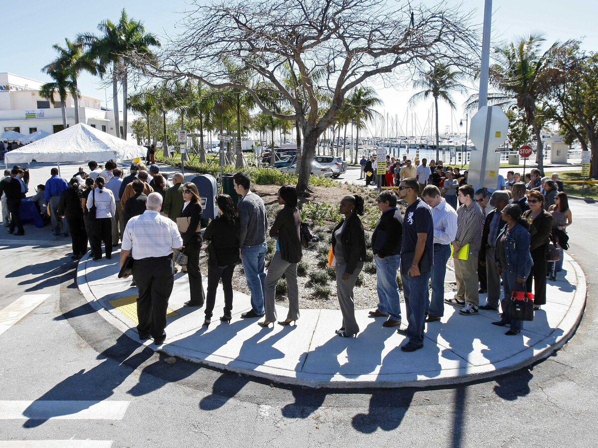 Job seekers line up to register at a Miami job fair in January. A new study shows that Florida voters discuss joblessness in ways quite different from those in Ohio and Virginia, two other presidential battleground states.