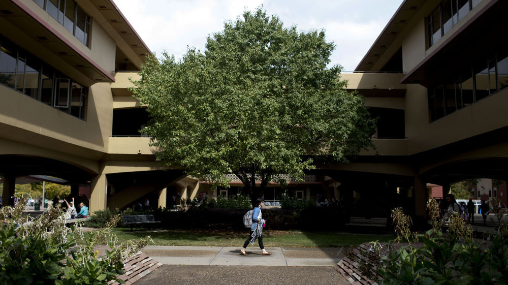 A student walks through the quad at Colorado State University in Fort Collins. Becky Lettenberger/NPR hide caption