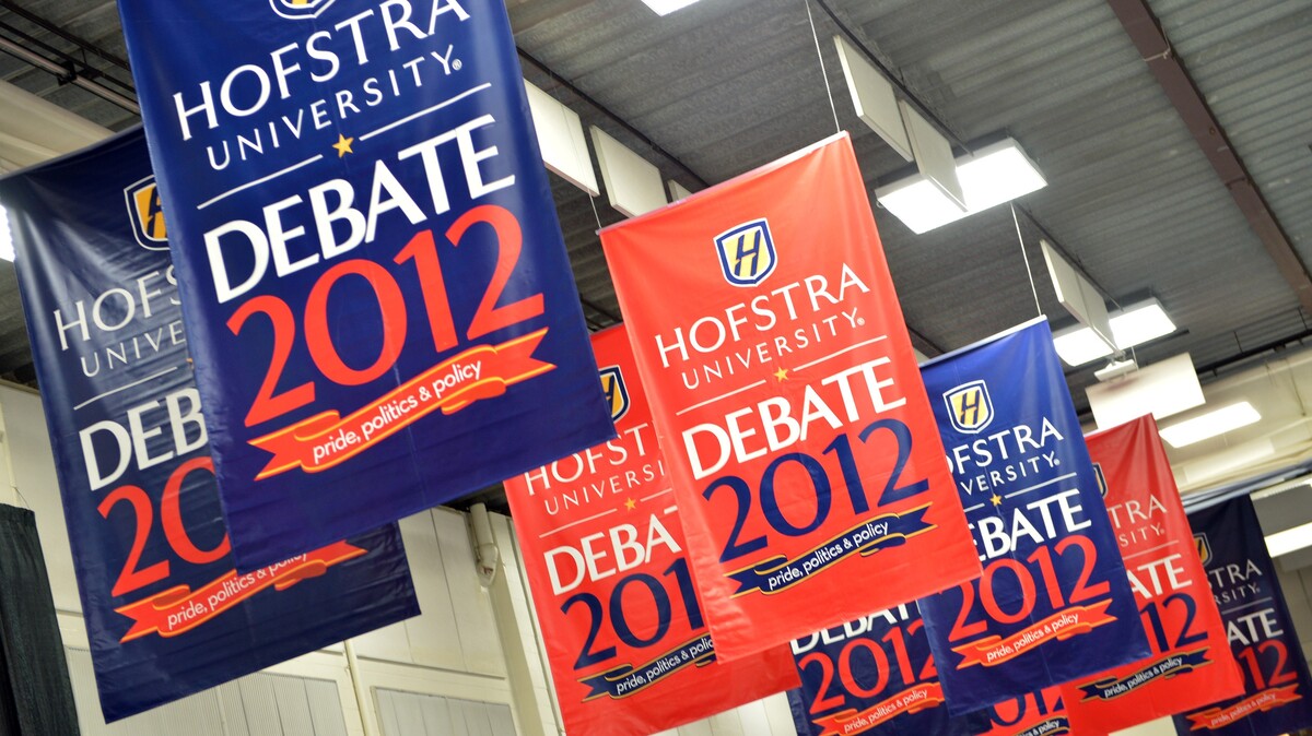 Banners hang inside the media center amid preparations for tonight's presidential debate at Hofstra University in Hempstead, N.Y. Stan Honda/AFP/Getty Images hide caption