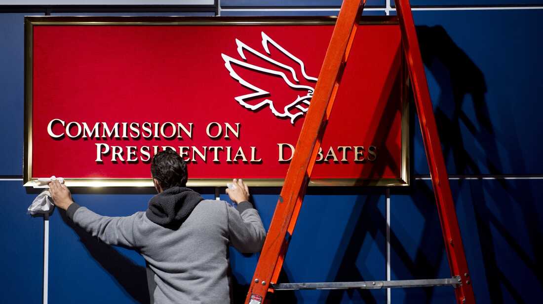 A worker cleans a sign before Tuesday's presidential debate at Hofstra University in Hempstead, N.Y. Saul Loeb/AFP/Getty Images hide caption