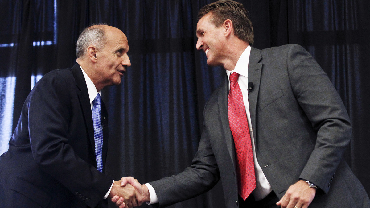Democrat Richard Carmona (left) and Republican Rep. Jeff Flake shake hands before Thursday's debate in Chandler, Ariz.