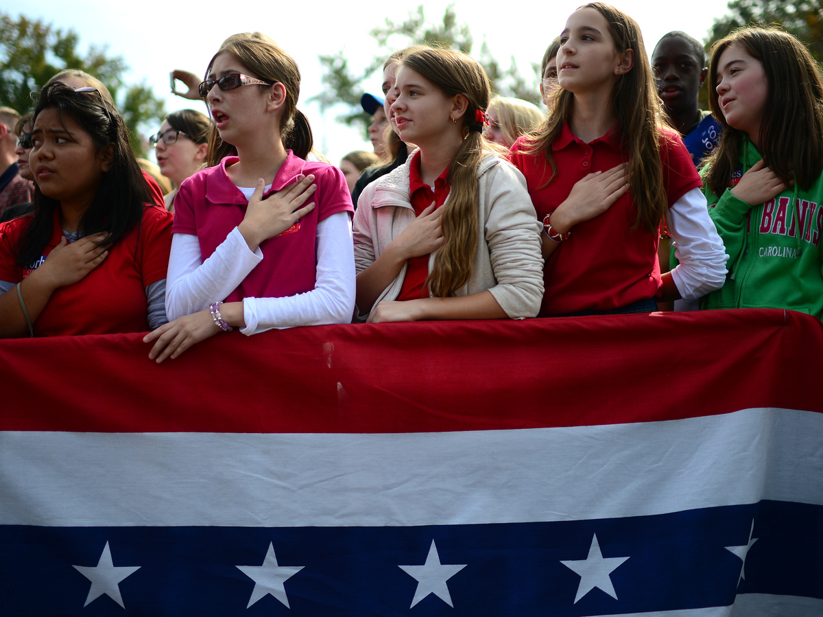 The crowd joins Republican Mitt Romney in singing the national anthem at a rally Wednesday in Chesapeake, Va.