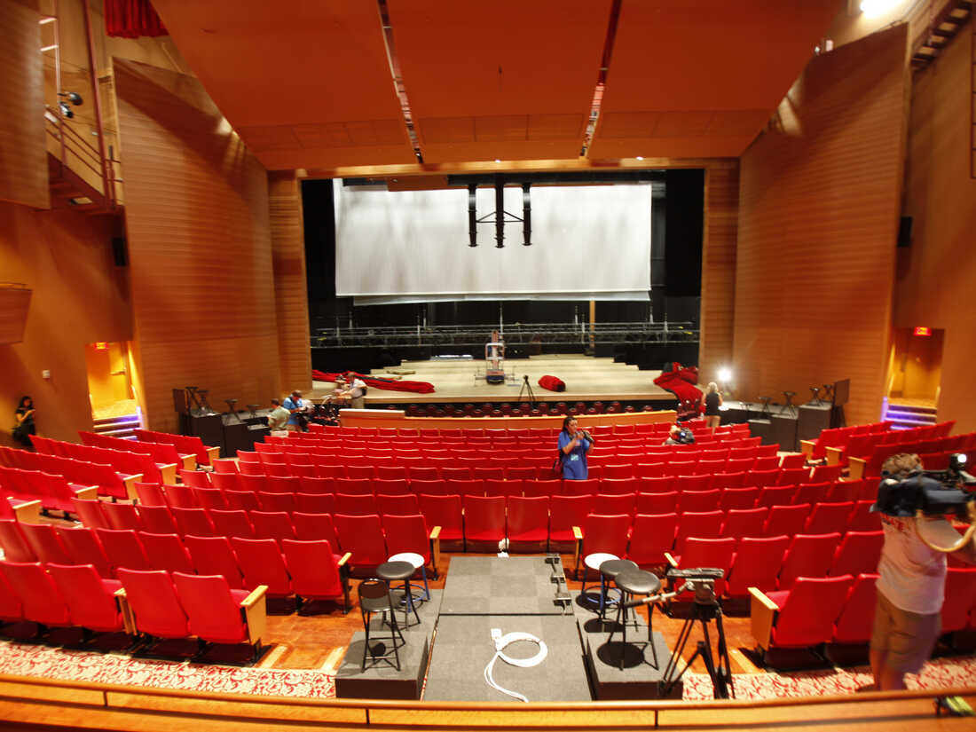 Members of the media tour the Keith C. and Elaine Johnson Wold Performing Arts Center on Thursday in advance of Monday's presidential debate. Wilfredo Lee/AP hide caption