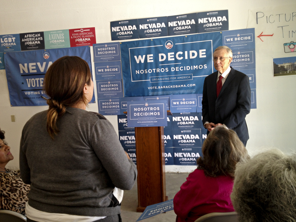 Senate Majority Leader Harry Reid of Nevada takes questions from Latino volunteers at an Obama field office in Las Vegas.