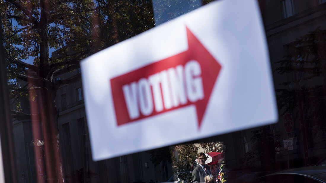 A sign directing voters to a polling place is seen during the first day of early voting on Monday in Washington, D.C.