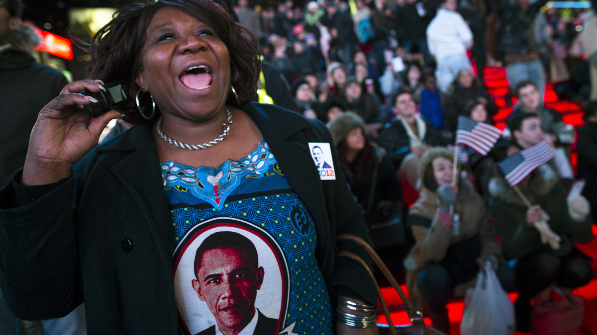 Martha Nunez, 53, of the Bronx, reacts to President Obama's victory Tuesday.