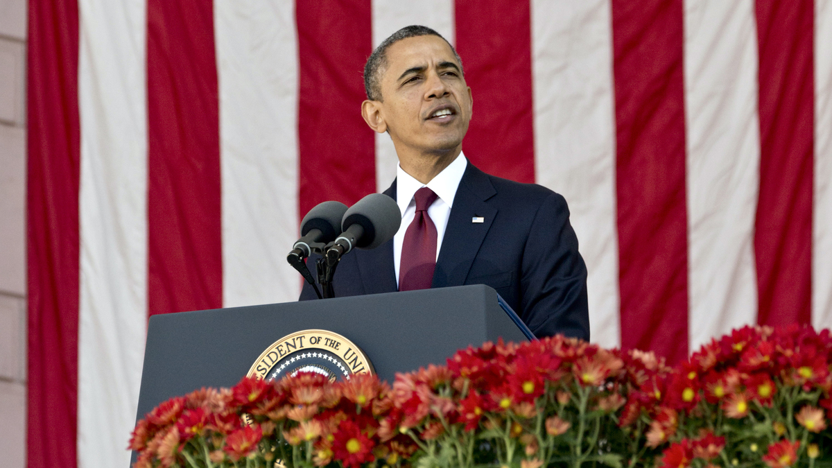 President Obama speaks during a Veterans Day ceremony in Arlington, Va., on Sunday. J. Scott Applewhite/AP hide caption
