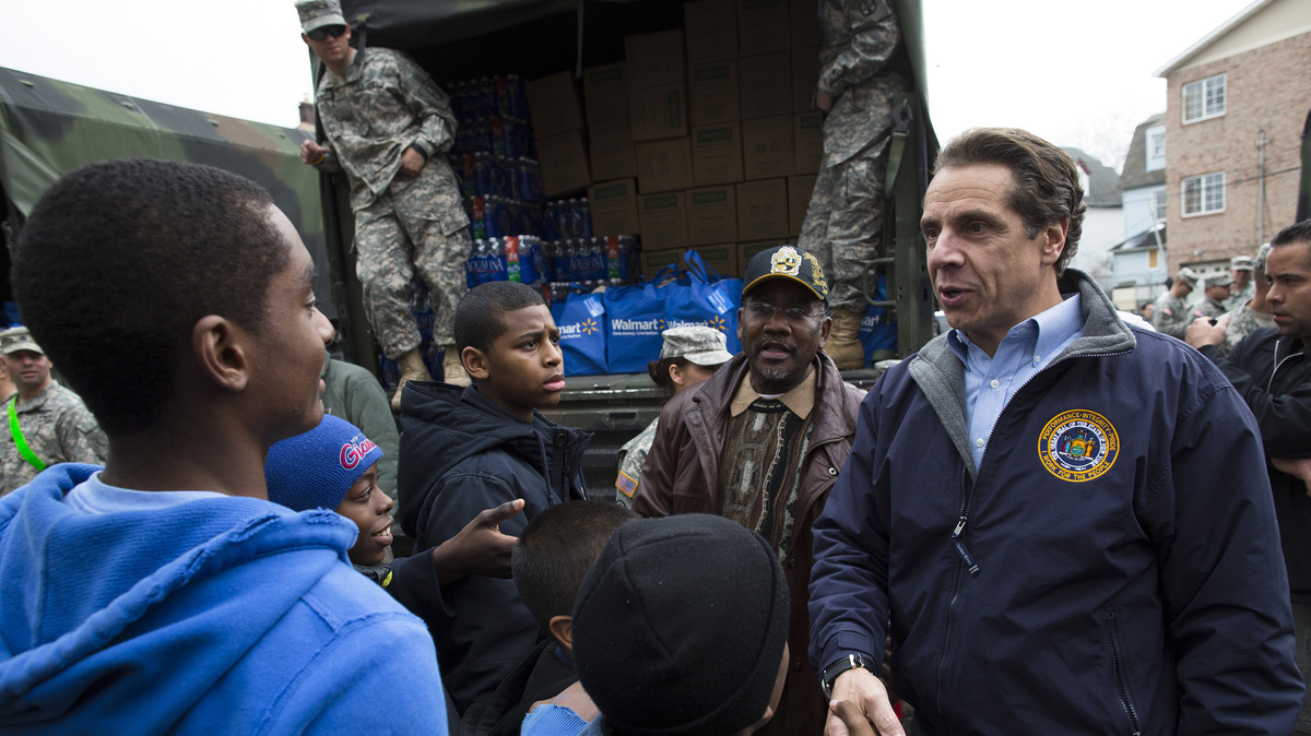 New York Gov. Andrew Cuomo meets Nov. 10 with residents of the Far Rockaways section of Queens, which was hit hard by Hurricane Sandy. Cuomo is seeking $30 billion in federal assistance to help rebuild his state at a time when Congress is already consumed with reducing the deficit. John Minchillo/AP hide caption