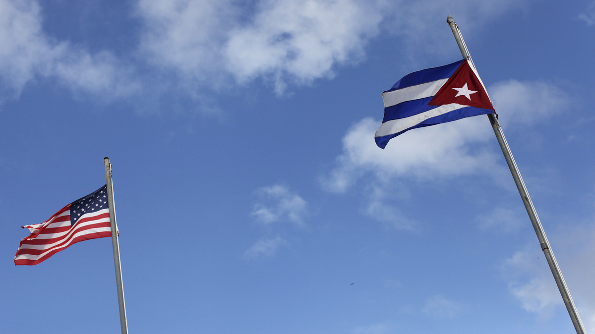 American and Cuban flags in the Little Havana neighborhood of Miami. Shannon Stapleton/Reuters /Landov hide caption