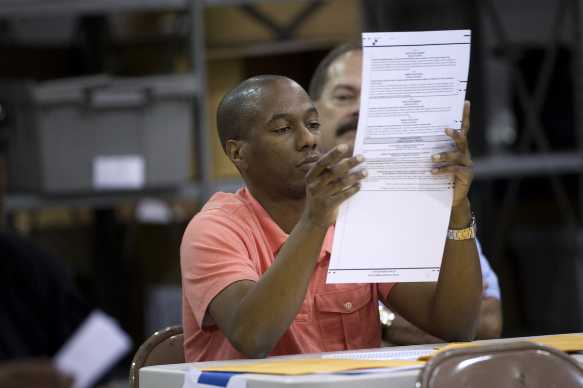 A Palm Beach County election worker counts ballots in Riviera Beach, Fla., on Nov. 9. Rep. Allen West contested the results of the election in Florida's 18th District for two weeks before conceding. Since 2000, the number of contested elections has more than doubled. J Pat Carter/AP hide caption