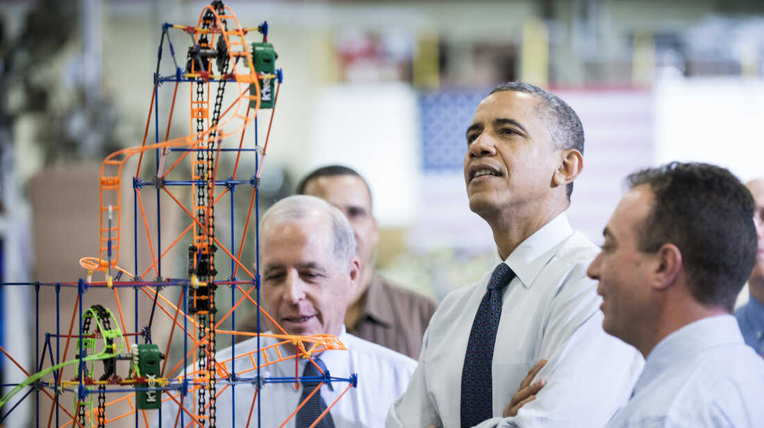President Obama examines a K'NEX roller coaster on Nov. 30 at a Hatfield, Pa., factory that makes the toys. During the visit, Obama spoke about the economy, the middle class and his plan to raise taxes on top wage earners. Brendan Smialowski/AFP/Getty Images hide caption