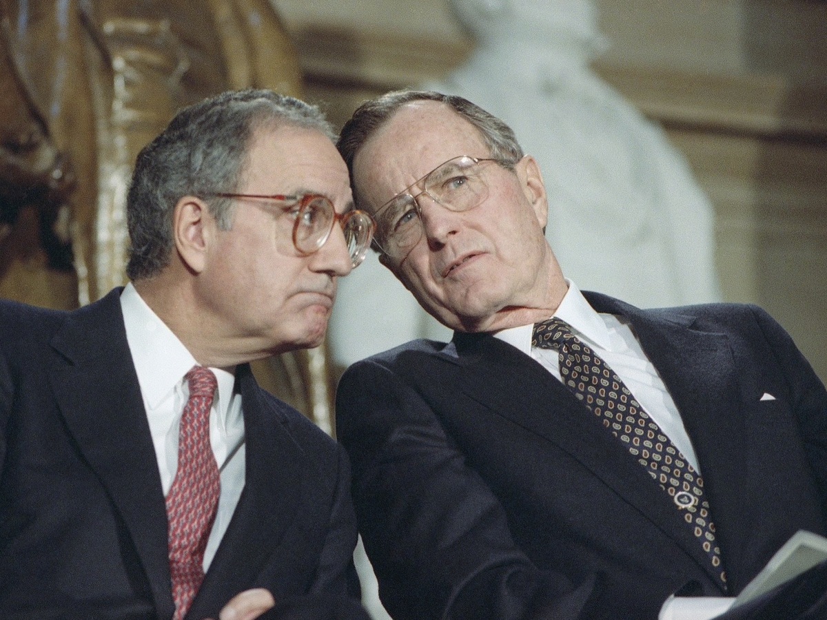 President George H.W. Bush, seen with Senate Majority Leader George Mitchell, D-Maine, in 1991, was punished at the ballot box for compromises that produced a budget-reduction act in 1990.
