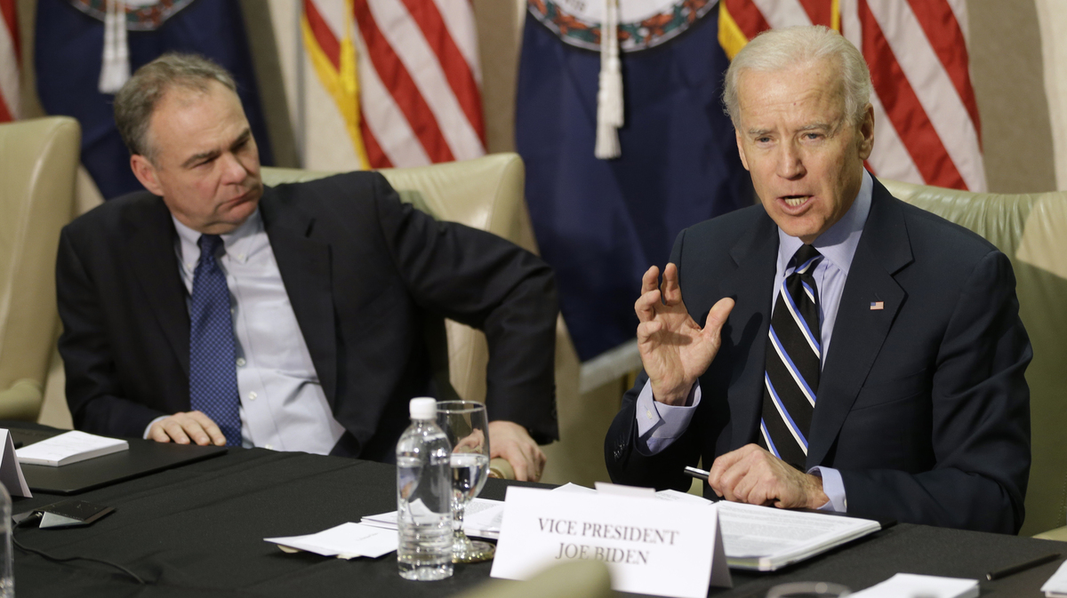 Vice President Joe Biden participates in a round-table discussion on gun violence at Virginia Commonwealth University with Sen. Tim Kaine, D-Va., on Friday. The panelists included people who worked on gun safety after the 2007 Virginia Tech shooting. Steve Helber/AP hide caption