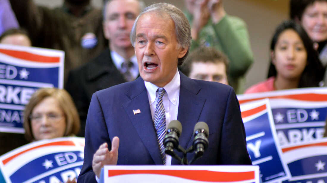 Rep. Ed Markey, D-Mass., speaks to supporters in Malden, Mass, on Feb. 2. Josh Reynolds/AP hide caption
