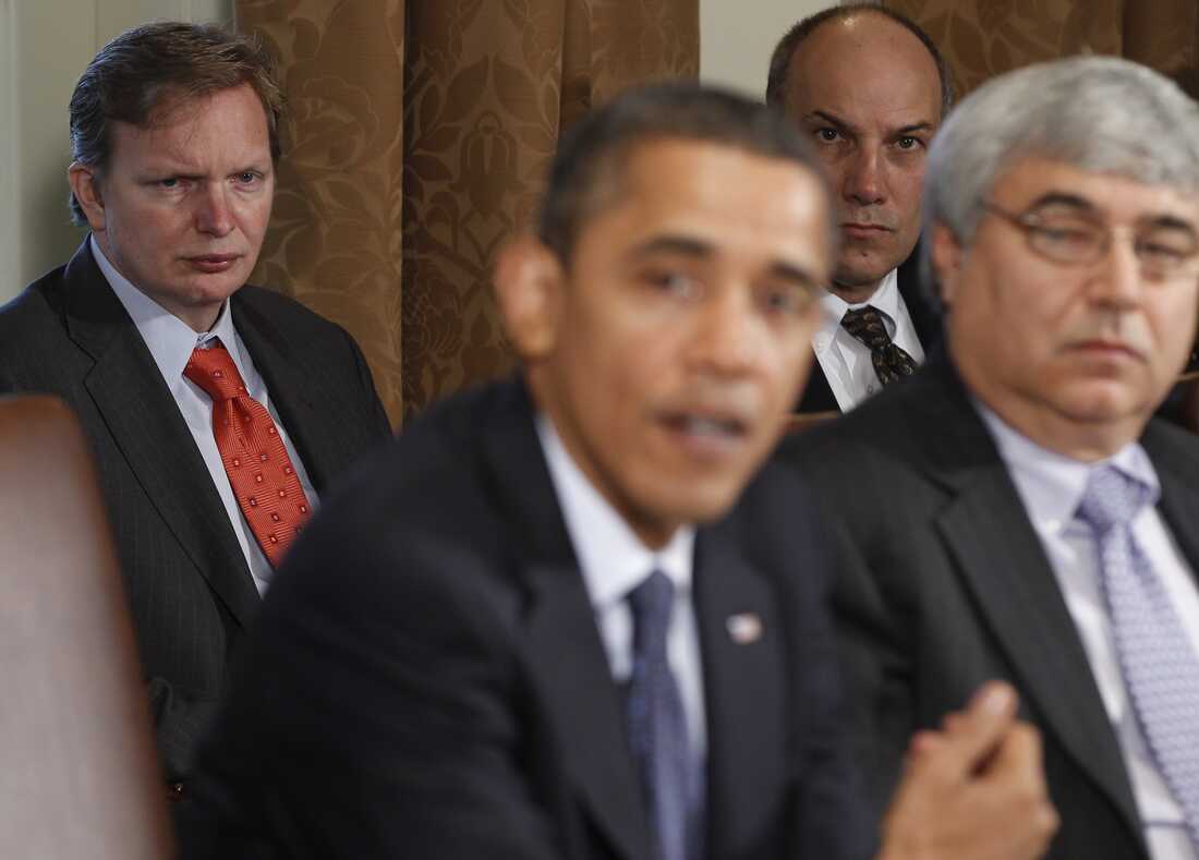 Jim Messina (left), the head of Organizing for Action and a former top Obama campaign and White House aide, watches President Obama make a statement in the White House Cabinet Room in 2010. Charles Dharapak/AP hide caption