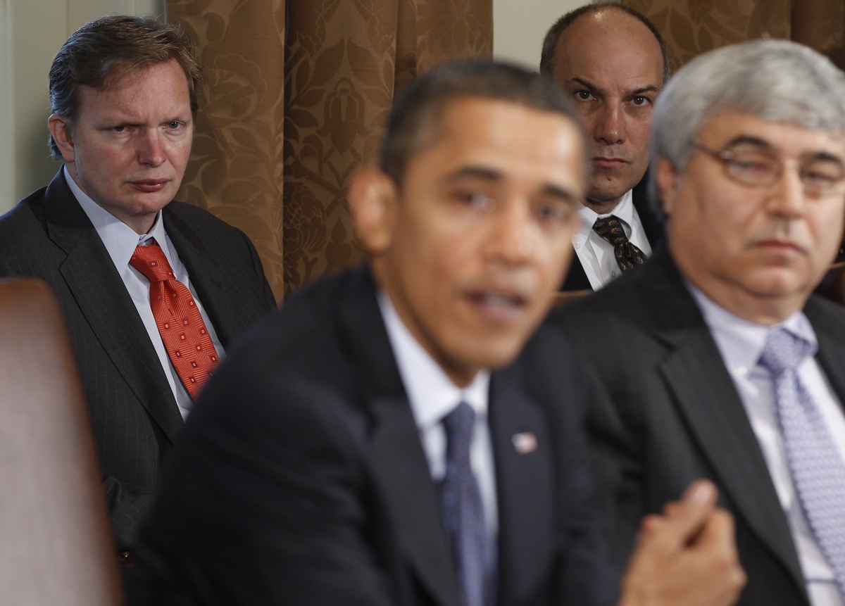 Jim Messina (left), the head of Organizing for Action and a former top Obama campaign and White House aide, watches President Obama make a statement in the White House Cabinet Room in 2010.