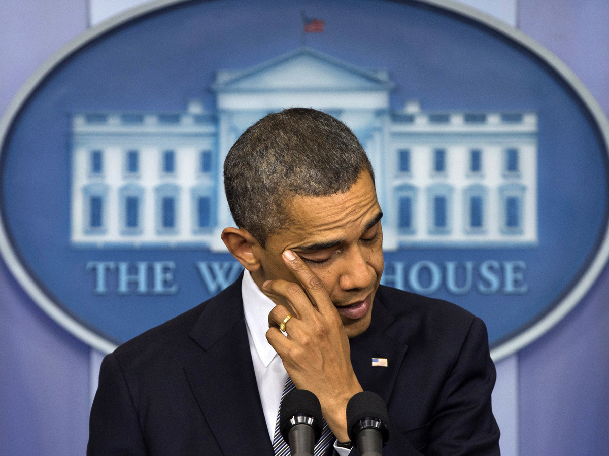 President Obama wipes away tears as he talks about the Connecticut elementary school shooting Dec. 14 in the White House briefing room. Obama was in Colorado on Wednesday and planned to visit Connecticut next week to keep pushing for new gun laws. Carolyn Kaster/AP hide caption