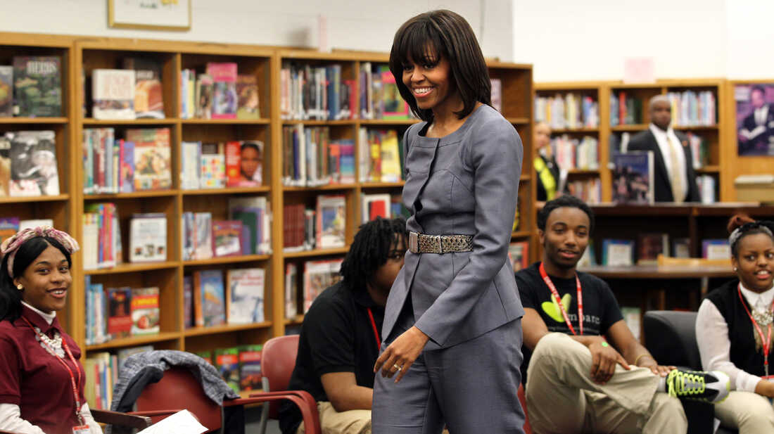 First lady Michelle Obama greets students at Harper High School in Chicago on Wednesday. Twenty-nine current or former Harper students have been shot in the past year, eight of them fatally. Nancy Stone/AP hide caption