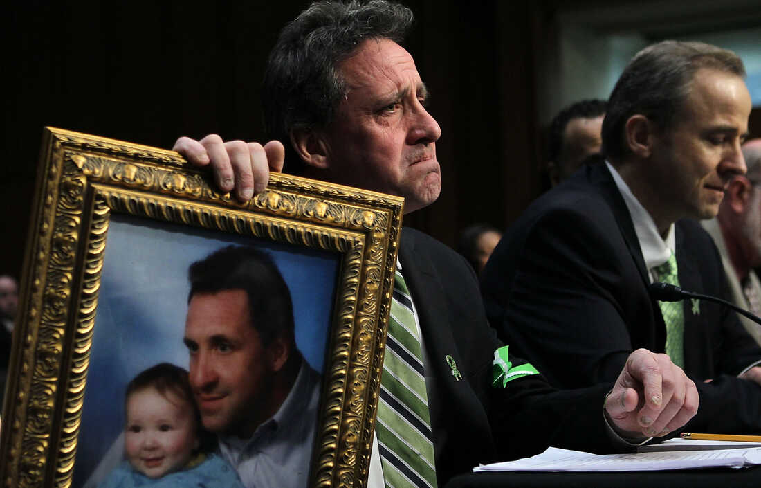 Neil Heslin, father of 6-year-old Sandy Hook Elementary School shooting victim Jesse Lewis, holds a picture of the two of them as he testifies during a hearing before the Senate Judiciary Committee in February. Alex Wong/Getty Images hide caption