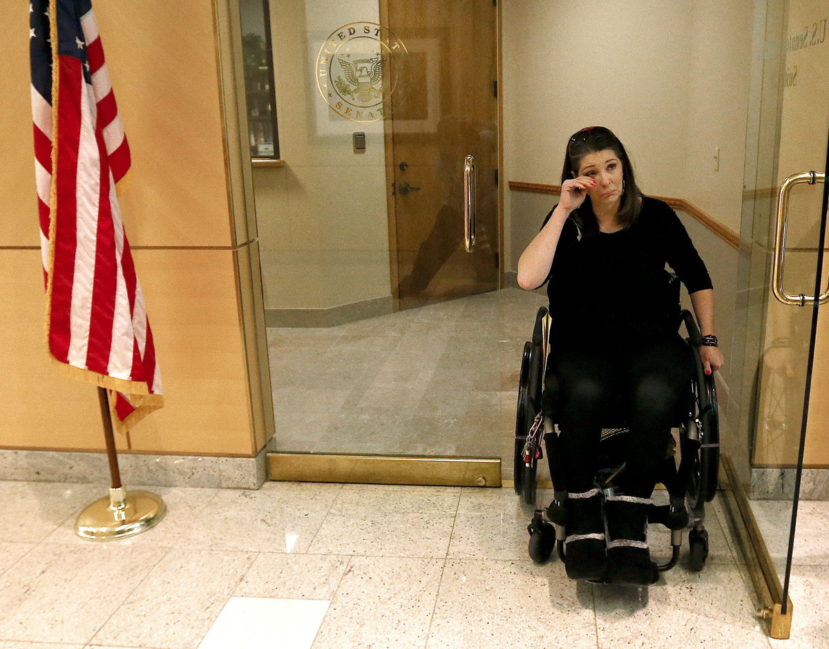 Jennifer Longdon, who survived gun violence but was left a paraplegic, wiped away tears at an April 19, 2013 protest at Arizona Republican Sen. Jeff Flake's Phoenix office.