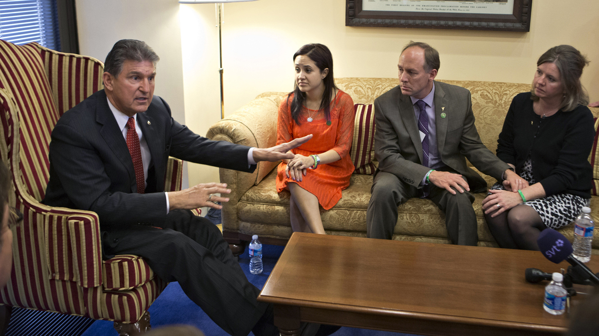 Sen. Joe Manchin, D-W.Va., meets in his office last week with families of victims of the Sandy Hook Elementary School shooting in Newtown, Conn. A bipartisan plan to expand background checks for gun buyers was defeated Wednesday in the Senate. J. Scott Applewhite/AP hide caption