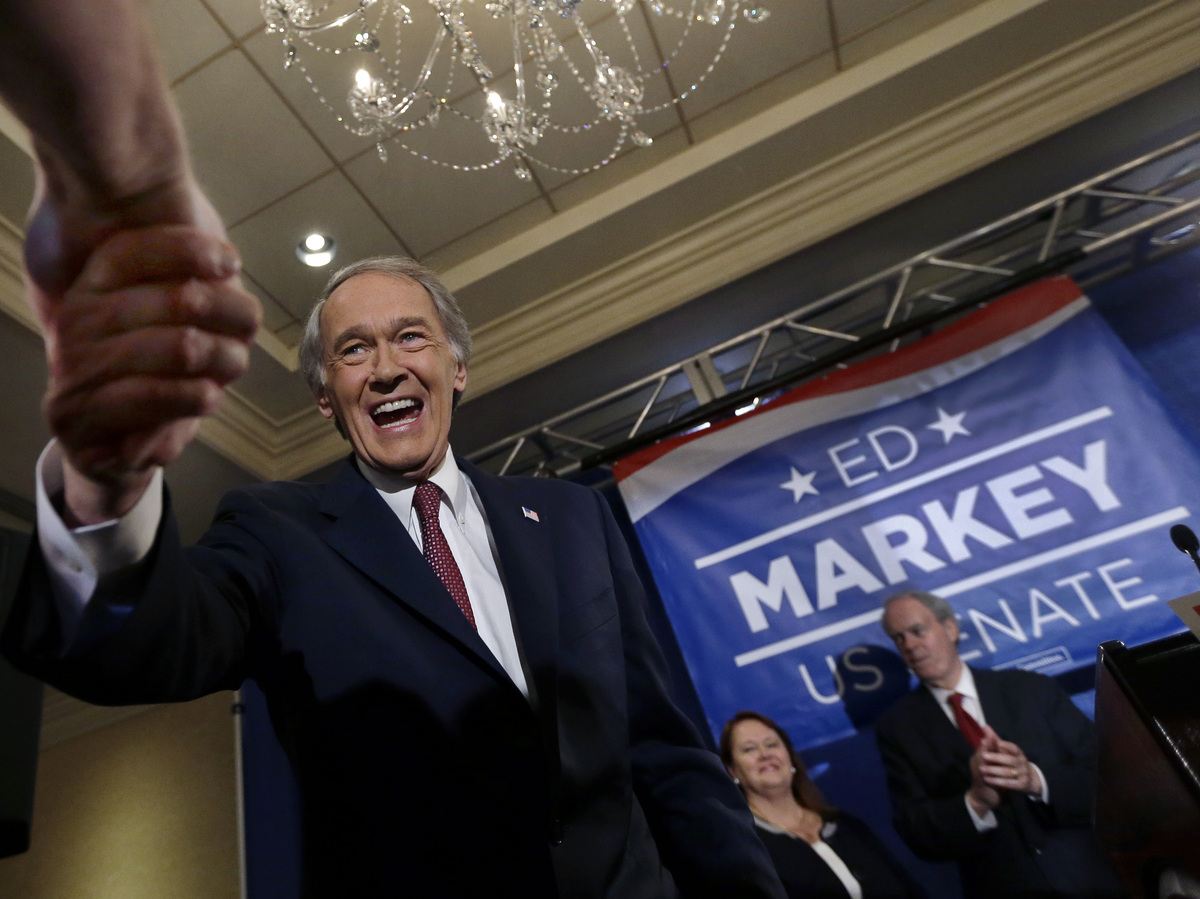Democratic Senate hopeful Rep. Ed Markey greets a supporter in Boston on Tuesday as he celebrates his primary win. Markey and Republican Gabriel Gomez won their party primaries Tuesday, setting up a race between a 36-year veteran of Washington politics and a political newcomer for the U.S. Senate seat formerly held by John Kerry.
