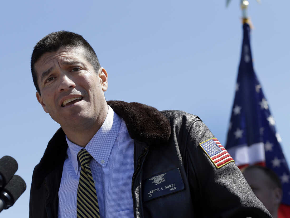 Republican U.S. Senate candidate and former Navy SEAL Gabriel Gomez speaks last month in South Boston, Mass. On Tuesday, Gomez won the GOP nomination and will face Democratic Rep. Ed Markey in a June 25 special election. Elise Amendola/AP hide caption