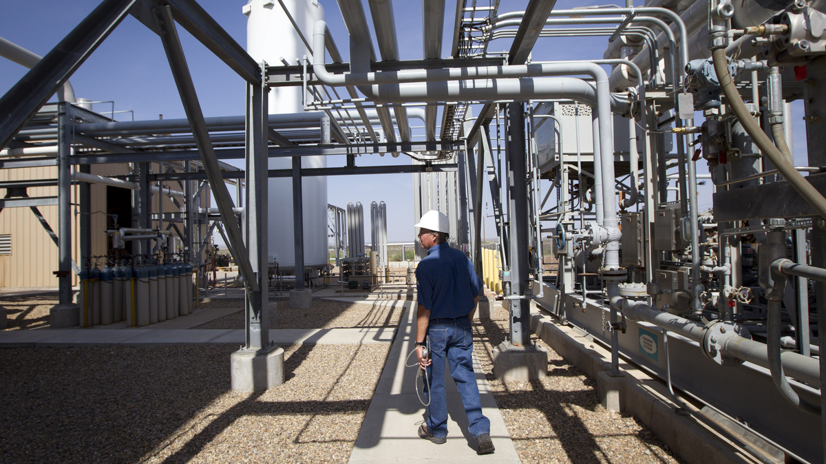 Deward Cawthon, a plant operator at the Federal Helium Reserve, walks through the Federal Crude Helium Enrichment Unit near Amarillo, Texas, in 2011.