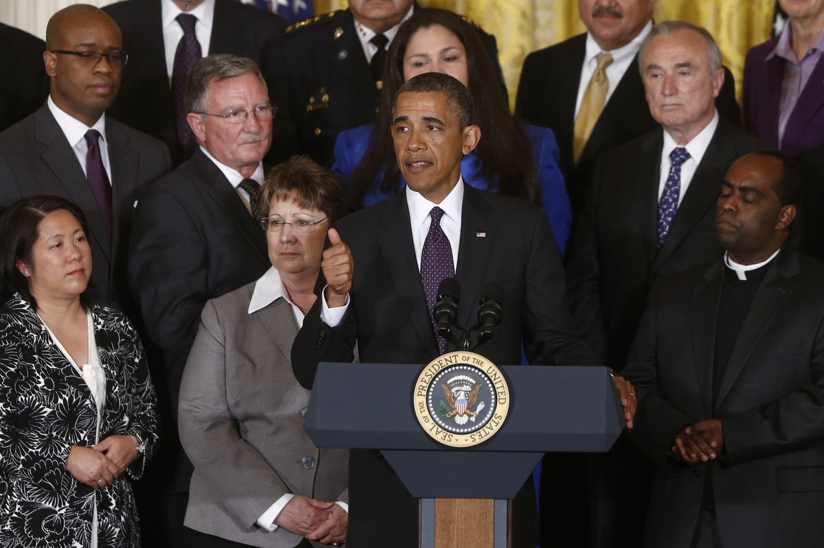 On gun control, an issue precipitated by December's Sandy Hook Elementary School massacre, a shocked and angry nation compelled him to take charge on the issue, which he did with Vice President Biden's task force and its wide-ranging recommendations.
