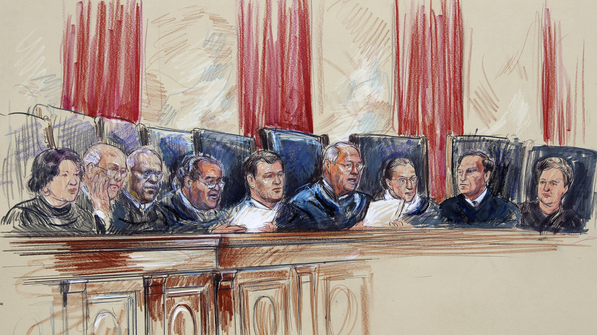 This artist rendering shows Supreme Court Justices (from left) Sonia Sotomayor, Stephen Breyer, Clarence Thomas, Antonin Scalia, John Roberts, Anthony Kennedy, Ruth Bader Ginsburg, Samuel Alito and Elena Kagan in 2012.