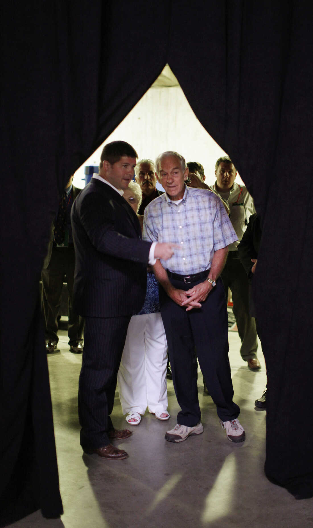 Jesse Benton, left, talks with then-Republican presidential candidate Rep. Ron Paul, R-Texas, in Ames, Iowa, on Aug. 13, 2011. Benton is now campaign manager for Sen. Mitch McConnell, R-Ky. Charles Dharapak/AP hide caption
