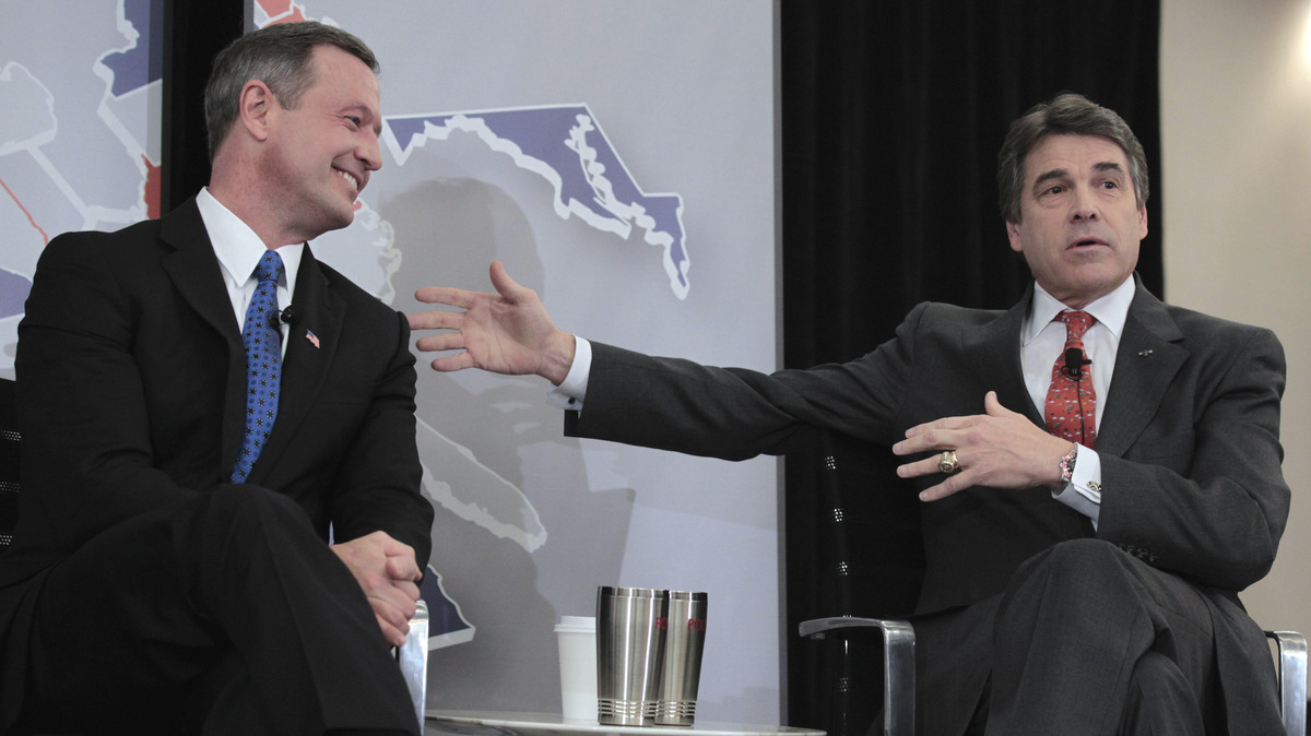 In friendlier times, Maryland Gov. Martin O'Malley, left, and Texas Gov. Rick Perry participate in a 2011 panel discussion in Washington, D.C. At the time, O'Malley was chairman of the Democratic Governors Association; Perry was chairman of the Republican Governors Association. Now they're in a spat over Perry's efforts to lure Maryland businesses to Texas.