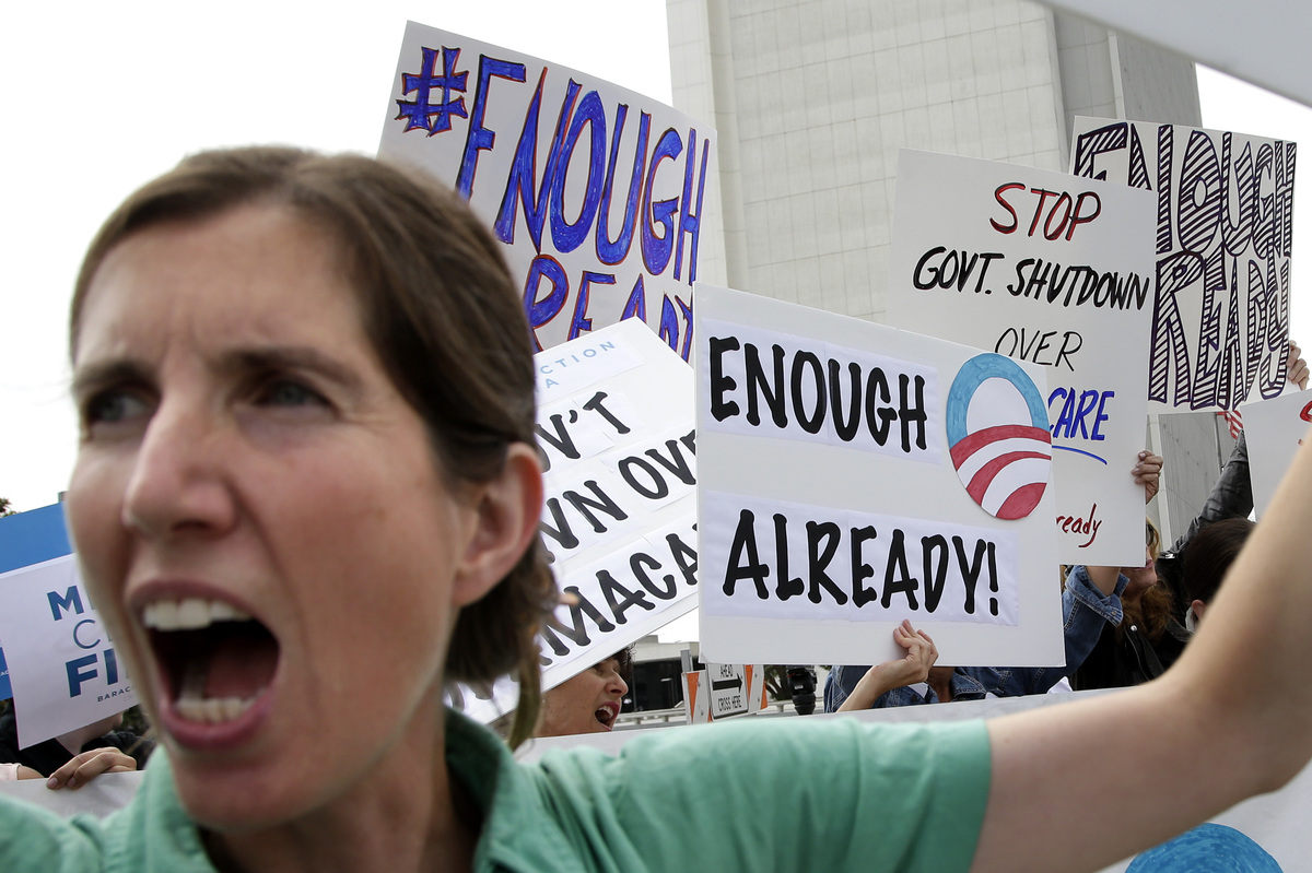 Anti-shutdown protesters in Los Angeles may have had enough of the budget crisis, but it appears to be far from over. Jae C. Hong/AP hide caption