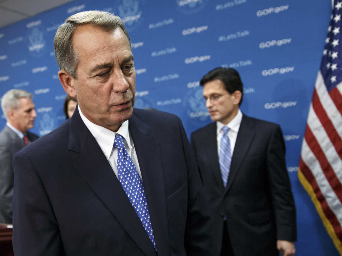 House Speaker John Boehner, accompanied by GOP Reps. Kevin McCarthy, Cathy McMorris Rodgers and Eric Cantor, spoke to the press Tuesday, as the partial government shutdown entered its second week. J. Scott Applewhite/AP hide caption