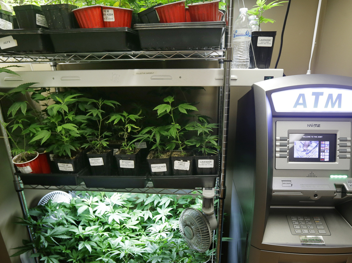 An ATM sits next to a rack of marijuana clone plants that are used to grow medical marijuana on Wednesday at The Joint, a medical marijuana cooperative in Seattle. Last week Washington became the second U.S. state to adopt rules for the recreational sale of marijuana. Ted S. Warren/AP hide caption