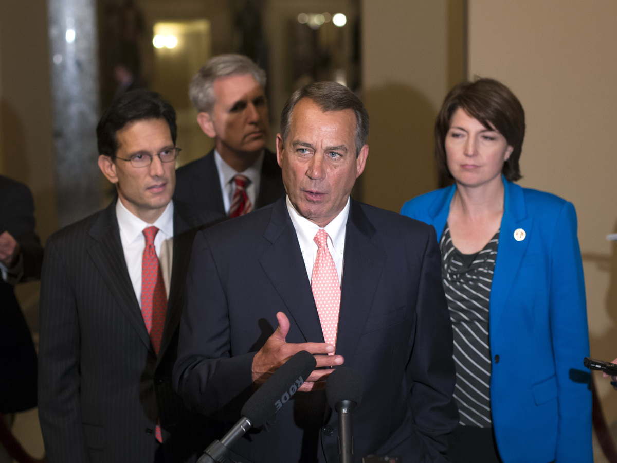 Speaker of the House John Boehner, R-Ohio (center), with House GOP leaders, speaks briefly to reporters on Oct. 1. Joining Boehner are (from left) House Majority Leader Eric Cantor, R-Va., House Majority Whip Kevin McCarthy, R-Calif., and Rep. Cathy McMorris Rodgers, R-Wash., the Republican conference chairwoman.