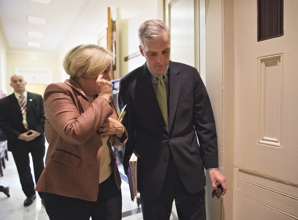 Sen. Claire McCaskill, D-Mo., and White House Chief of Staff Denis McDonough after anxious Senate Democrats met privately on Capitol Hill with Obama administration officials about Obamacare, Oct. 31, 2013.