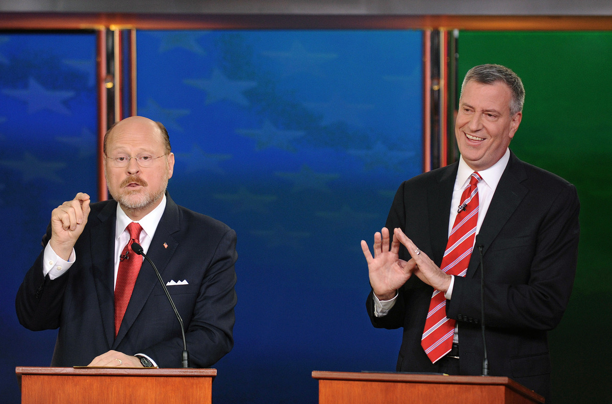 Republican Joe Lhota (left) makes a point during a debate with Bill de Blasio, his Democratic rival in the New York City mayor's race, on Oct. 30.