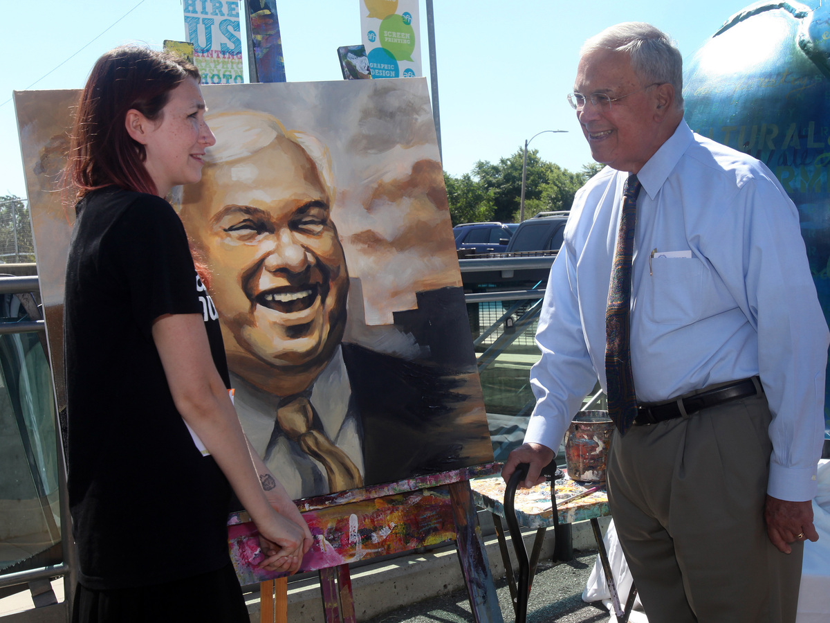 Sadia Bies and Boston Mayor Thomas Menino stand next to her portrait of him at a July press conference. Menino, the city's longest-serving mayor, is stepping down at the end of his term.
