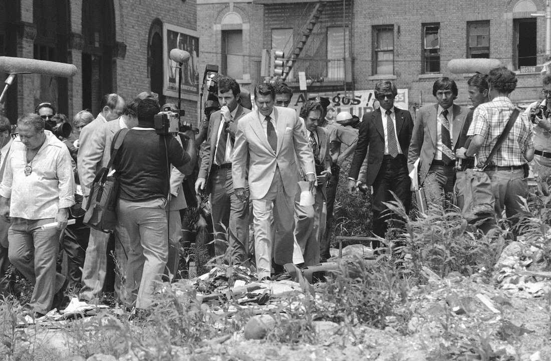 Ronald Reagan walks over rubble in a South Bronx lot in August 1980.