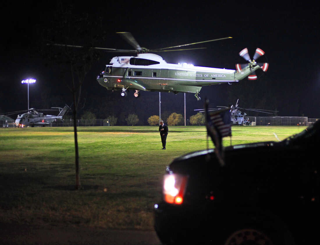Marine One, with President Obama aboard, lands at a Los Angeles park on Monday as part of Obama's three-day West Coast trip that combined fundraising and official business. Pablo Martinez Monsivais/AP hide caption