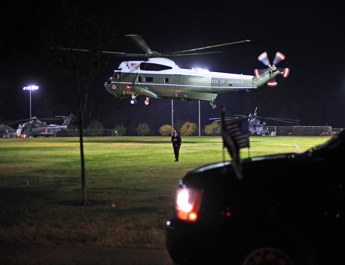 Marine One, with President Obama aboard, lands at a Los Angeles park on Monday as part of Obama's three-day West Coast trip that combined fundraising and official business.