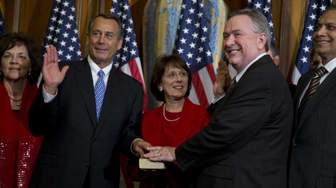 Texas Rep. Steve Stockman participates in a mock swearing-in ceremony with House Speaker John Boehner in January. Stockman made the surprise move to challenge Sen. John Cornyn in the 2014 Texas GOP primary.