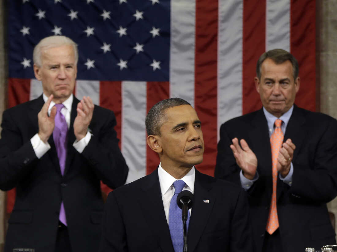 Vice President Biden and House Speaker John Boehner of Ohio applaud President Obama as he gives his State of the Union address during a joint session of Congress on Feb. 12, 2013. Charles Dharapak/AP hide caption