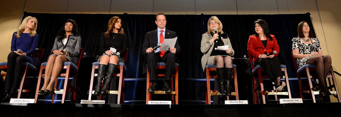 Republican National Committee Chairman Reince Priebus and RNC Co-Chair Sharon Day (third from right) introduce the group's latest "rising stars" Thursday in Washington: Alison Howard (from left), Chelsi P. Henry, Monica Youngblood, Kimberly Yee and Alex Smith. Andrew Harnik /The Washington Times/Landov hide caption